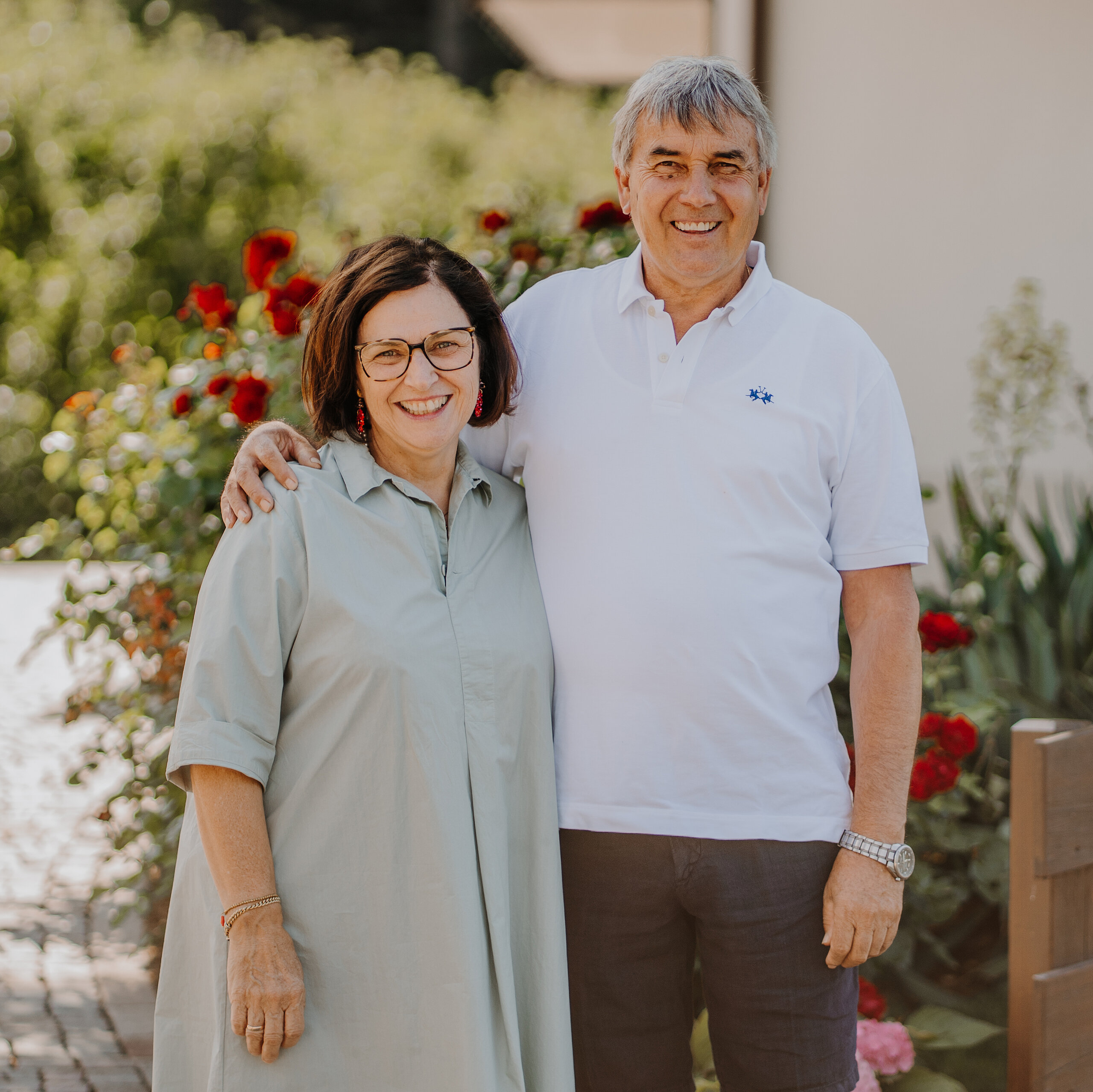 Zwei, die den Waidmannhof mit Herz führen. Christine empfängt Sie mit einem Lächeln. Karl arbeitet draußen am Hof.